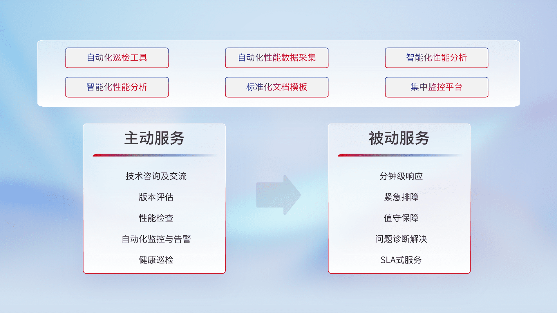 智能化工具和标准化文档,,保障服务质量,,提供主动服务(包含技术咨询、、版本评估、、性能检查、、自动化监控与告警、、健康巡检)和被动服务包含(分钟级响应、、、紧急排障、、、值守保障、、、、问题诊断解决、、、、SLA服务)。。